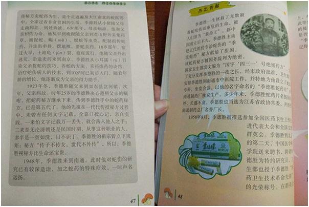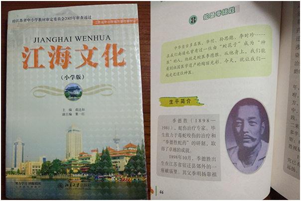 10月9日,江苏南通市各家小学五年级学生拿到了一本新书,这就是由江苏省中小学教材审定委员会审定通过,北京大学出版社出版的《江海文化》教材。书中浓墨重彩地介绍了一代蛇圣季德胜先生的生平简介、杰出贡献、传奇故事。