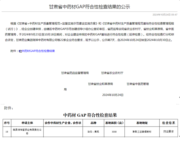 10月24日,甘肃省药品监督管理局在官网发布公示:根据《甘肃省监督实施示范建设实施方案》和《甘肃省中药材生产质量管理规范基地符合性检查管理规程(试行)》,经企业创建申报,由辖区中药材GAP示范创建领导小组办公室初审后,省药监局会同省农业农村厅、省林业和草原局、省中…