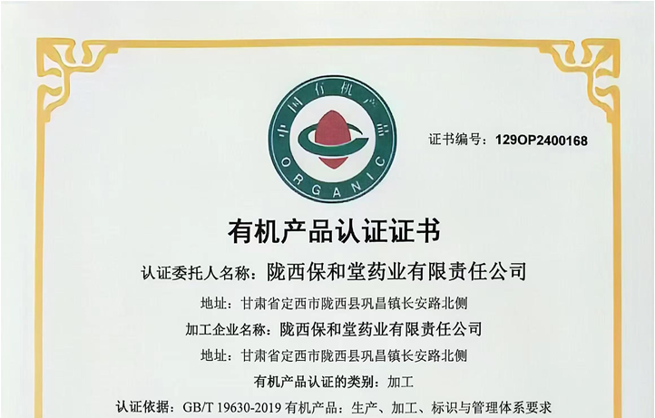 9月,陇西保和堂药业顺利通过了一年一度的有机产品认证,获得黄芪、党参、当归植物类中药材加工制品有机产品认证证书,以及黄芪、党参、当归代用茶加工有机产品认证证书。有机认证证书的取得,是对陇西保和堂多年来在有机种植基地建设和有机产品加工方面所做工作的充分肯定,认…
