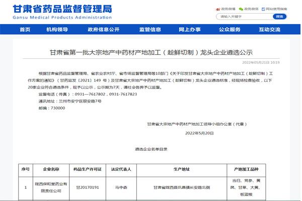 5月21日,甘肃省药品监督管理局在官网发布公示:根据甘肃省药品监督管理局、省农业农村厅、省市场监督管理局等10部门《关于印发甘肃省大宗地产中药材产地加工(趁鲜切制)工作方案的通知》(甘药监发〔2021〕149 号)及甘肃省大宗地产中药材产地加工(趁鲜切制)龙头企业遴选标…