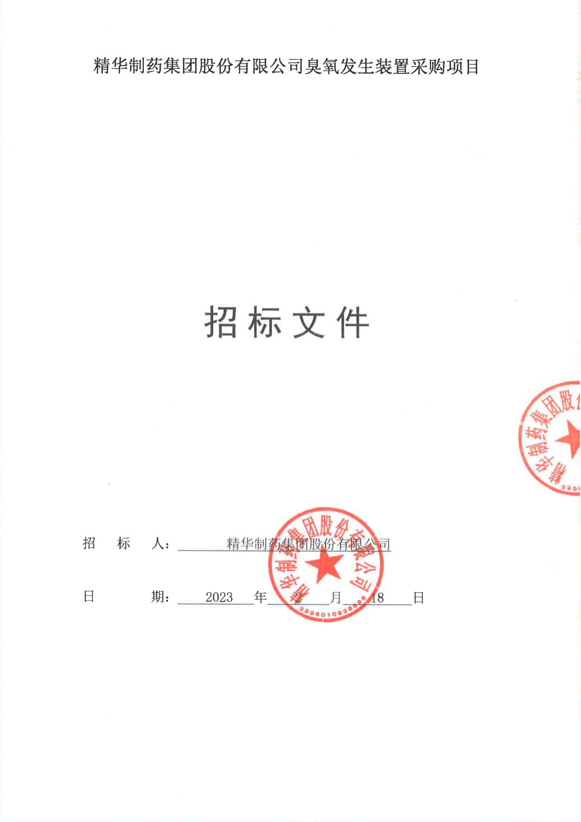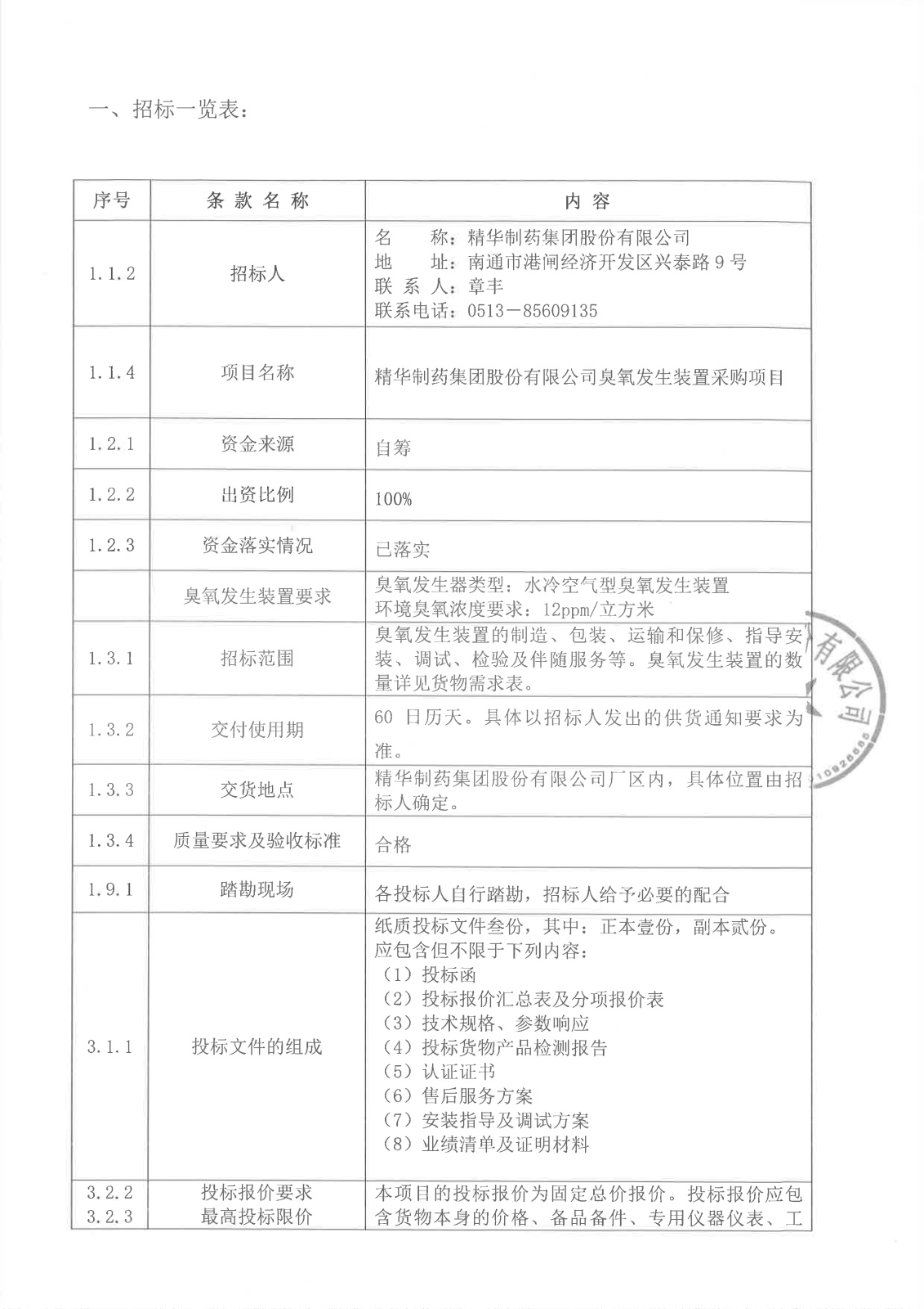关于制剂生产分公司臭氧发生装置采购项目招标文件,详见下图: